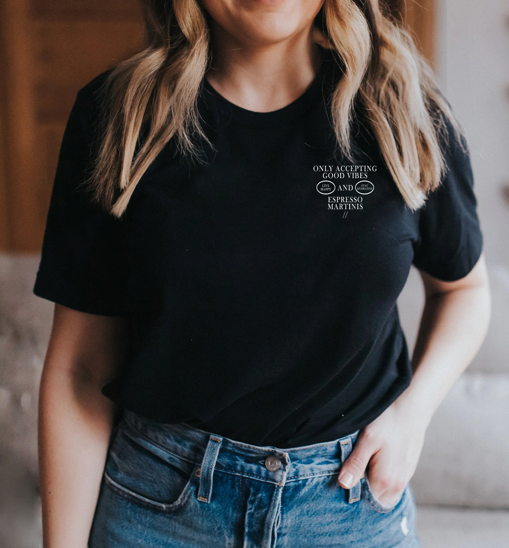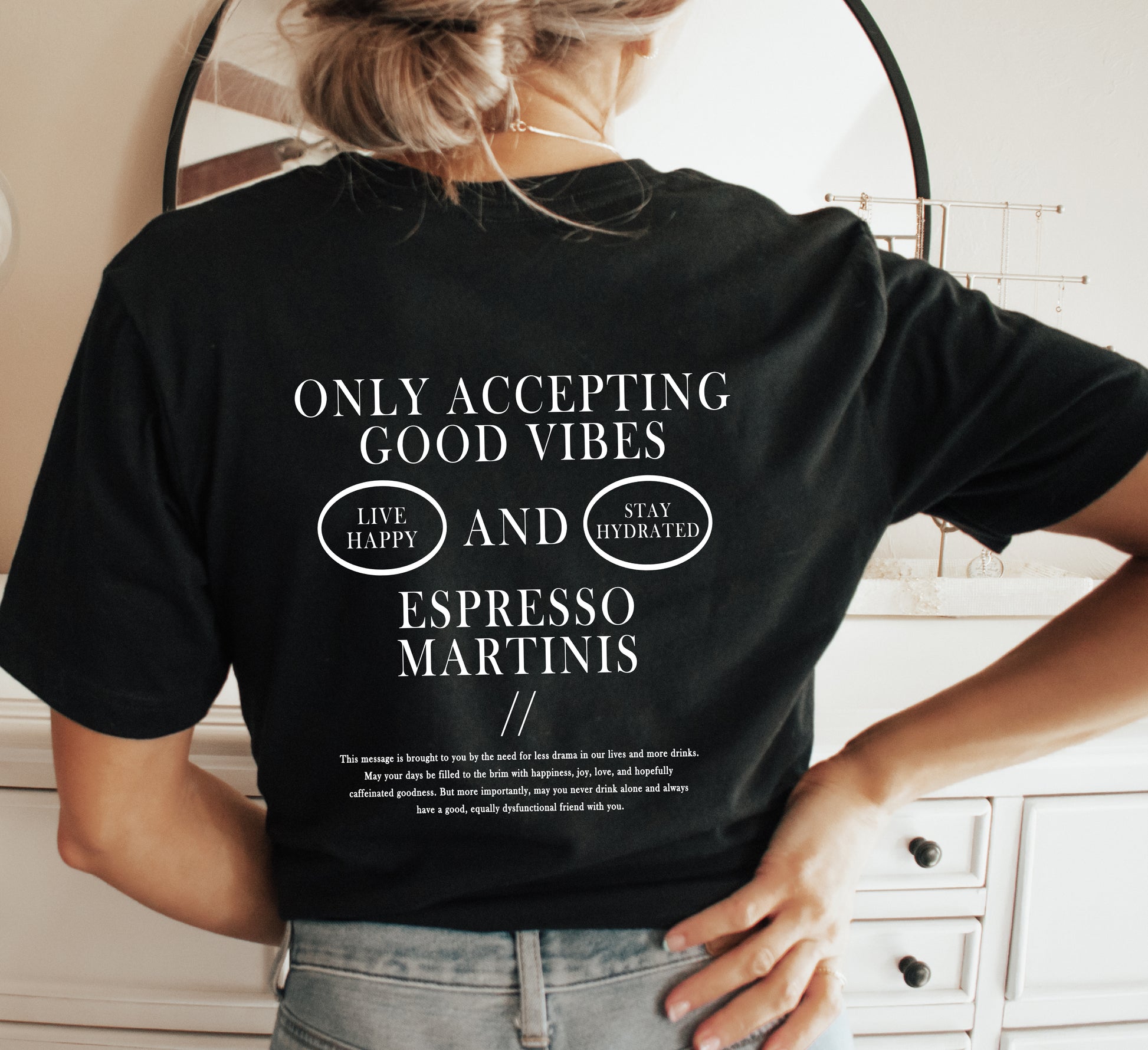 Good vibes and espresso martinis—the perfect combo for anyone who runs on caffeine and positivity. This tee celebrates the art of balancing life's simple pleasures: great coffee drinks and an even better attitude. Soft, comfortable, and ready to make a statement, it's ideal for coffee lovers, cocktail enthusiasts, and anyone who believes a little humor makes everything better. Wear it to brunch, casual outings, or whenever you need a mood boost.